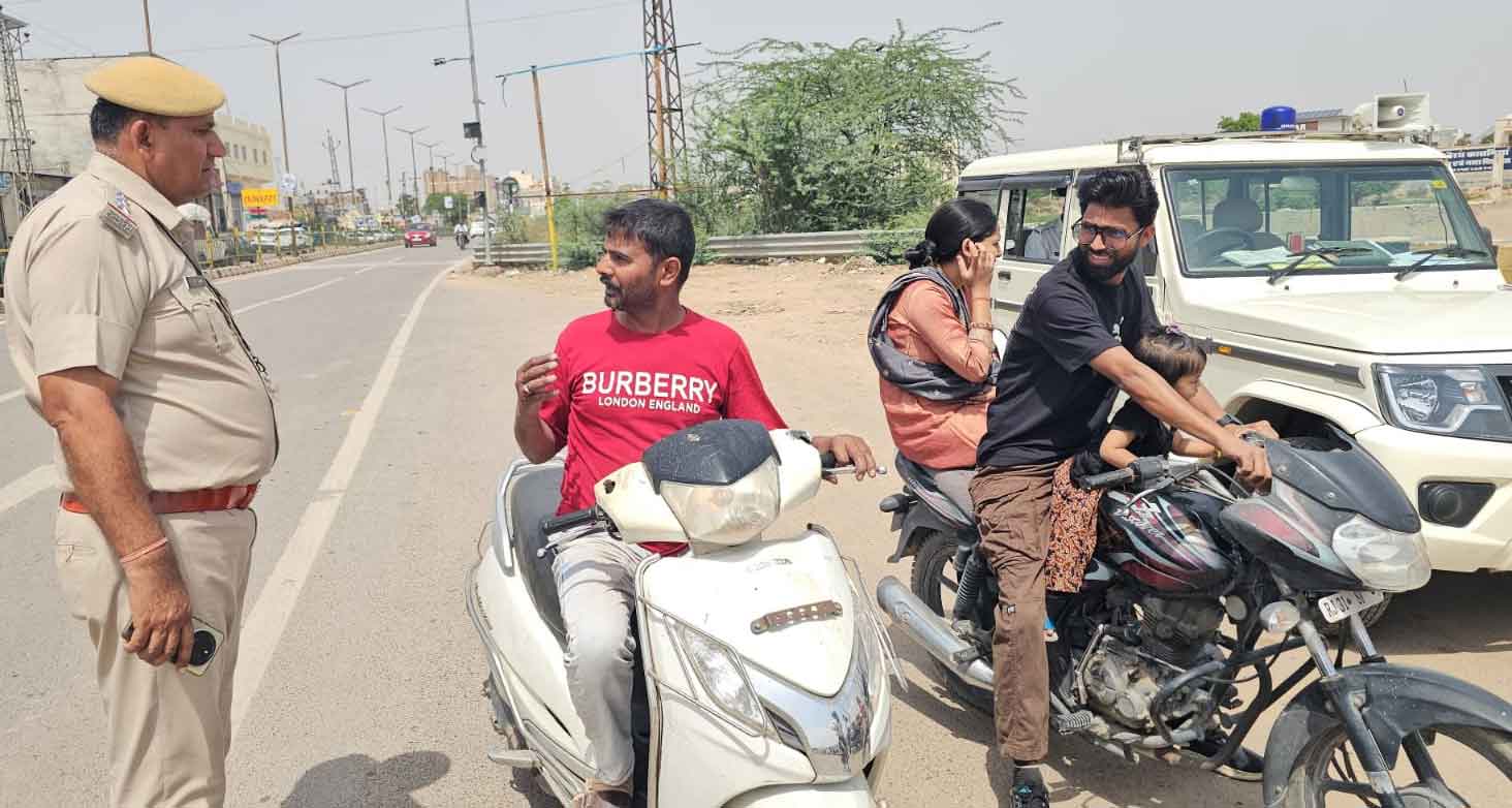 हनुमानगढ़। सड़क सुरक्षा और जीवन रक्षा को ध्यान में रखते हुए जिले में यातायात पुलिस की ओर से विशेष अभियान चलाया जा रहा है। पुलिस अधीक्षक नरेंद्र सिंह मीना के निर्देशानुसार चल रहे इस अभियान के तहत आमजन को यातायात नियमों के प्रति जागरूक करने के साथ-साथ नियमों की अवहेलना करने वालों के खिलाफ सख्त कार्रवाई भी की जा रही है। इसी क्रम में शनिवार को यातायात शाखा प्रभारी अनिल चिन्दा ने टीम के साथ जंक्शन क्षेत्र में टाउन रोड स्थित घग्घर पुल पर नाकाबंदी कर वाहनों की जांच की। इस दौरान यातायात नियमों का उल्लंघन करने वाले वाहन चालकों के खिलाफ कार्रवाई करते हुए करीब 80 चालान काटे गए। Hanumangarh Traffic Police