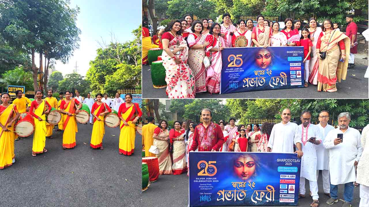 गाजियाबाद (सच कहूँ/रविंद्र सिंह)। Ghaziabad: इंदिरापुरम स्थित शिप्रा सनसिटी में इस वर्ष की बंगोतरु दुर्गा पूजा 2025 का शुभारंभ शनिवार को एक भव्य और आध्यात्मिक प्रभात फेरी के साथ हुआ। यह आयोजन बंगोतरु पूजा समिति द्वारा आयोजित 25वें “स्वप्नेर” आनंद मेला की शुरुआत भी था, जो श्रद्धा, संस्कृति और समरसता का प्रतीक बन गया। सुबह के समय निकाली गई प्रभात फेरी ने शिप्रा सनसिटी को भक्ति, उल्लास और ऊर्जा से सराबोर कर दिया। इस वर्ष की प्रभात फेरी की सबसे बड़ी विशेषता रही,महिलाओं द्वारा ढाक बजाना, जो ना केवल एक सांस्कृतिक पहल थी, बल्कि नारी सशक्तिकरण का प्रेरणादायक उदाहरण भी बनी।