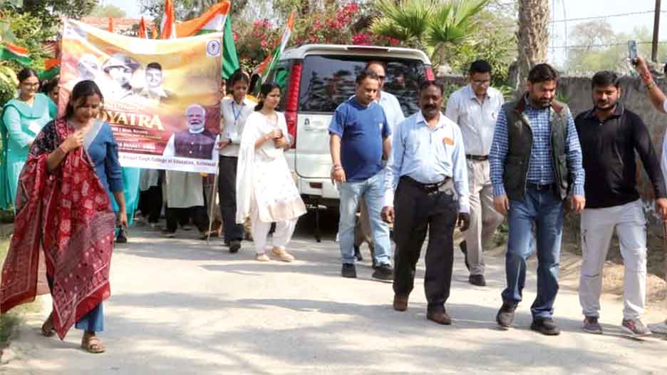 कालांवाली । शहीदी दिवस के अवसर पर मेरा युवा भारत (युवा कार्यक्रम एवं खेल मंत्रालय, भारत सरकार) के तत्वावधान में मेरा भारत, मेरी जिम्मेदारी थीम के तहत भव्य पदयात्रा का आयोजन किया गया। कार्यक्रम में क्षेत्र के युवाओं ने बढ़-चढ़कर भाग लेते हुए देशभक्ति का जोश दिखाया। इस आयोजन में शहीद भगत सिंह कॉलेज ऑफ एजुकेशन का विशेष सहयोग रहा। पदयात्रा की शुरूआत महाविद्यालय परिसर से हुई और प्रतिभागियों ने मार्ग में भगत सिंह की प्रतिमा पर पुष्प अर्पित कर श्रद्धांजलि दी।
