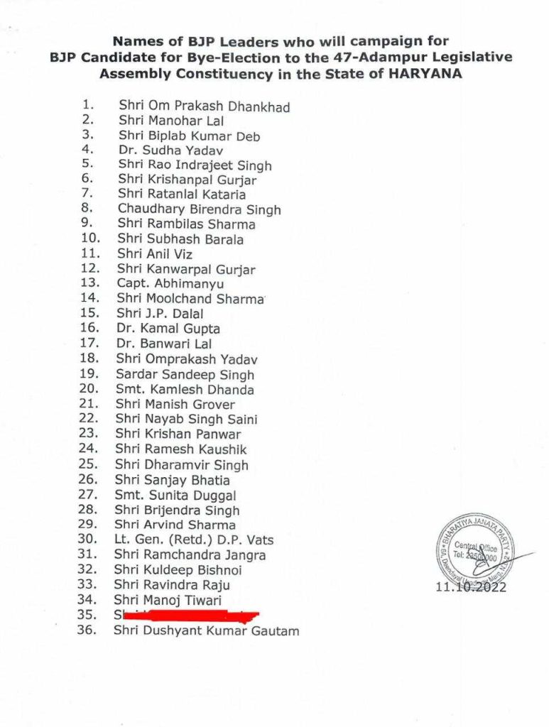 आदमपुर उपचुनाव: भाजपा ने जारी की स्टार प्रचारकों की सूची