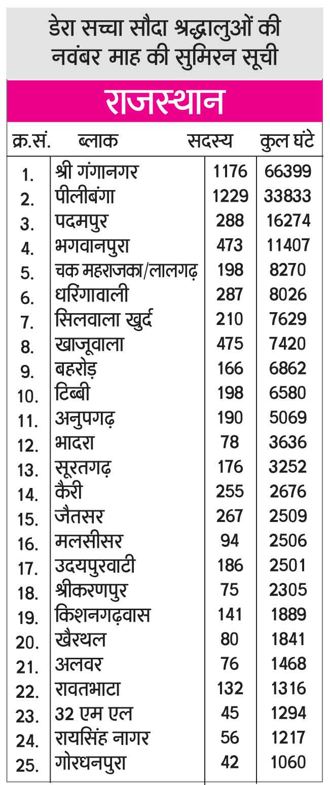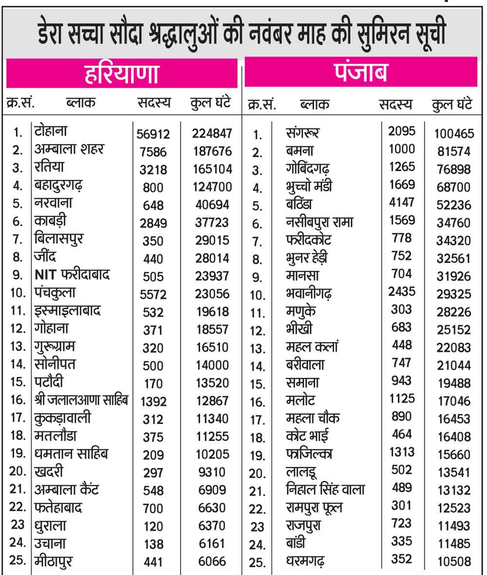 इस ब्लॉक के 56,912 सेवादारों ने 2,24,847 घंटे सुमिरन किया है। जबकि दूसरा और तीसरी स्थान भी हरियाणा के ही ब्लॉकों ने हासिल किया। जिसमें अंबाला जिले के अंबाला सिटी के 7,586 डेरा श्रद्धालुओं ने 1,87,676 घंटे अंखड सुमिरन कर दूसरा और फतेहाबाद जिले के रतिया ब्लॉक के 3,218 सेवादारों ने 1,65,104 घंटे रामनाम का जाप कर तीसरा स्थान प्राप्त किया। टॉप-10 सूची में 4 ब्लॉक हरियाणा, 5 ब्लॉक पंजाब और एक राजस्थान का शामिल है।