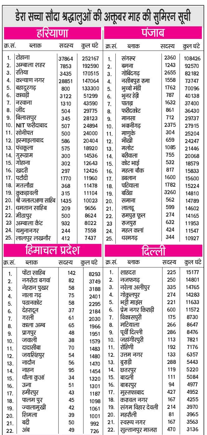 इस ब्लॉक के 37,864 सेवादारों ने 2,52,167 घंटे सुमिरन किया है। जबकि दूसरा और तीसरी स्थान भी हरियाणा के ही ब्लॉकों ने हासिल किया। जिसमें अंबाला जिले के अंबाला सिटी के 7,853 डेरा श्रद्धालुओं ने 1,92,590 घंटे अंखड सुमिरन कर दूसरा और फतेहाबाद जिले के रतिया ब्लॉक के 3,435 सेवादारों ने 1,70,515 घंटे रामनाम का जाप कर तीसरा स्थान प्राप्त किया। टॉप-10 सूची में 5 ब्लॉक हरियाणा और 5 ब्लॉक पंजाब के शामिल हैं। Akhand Sumiran