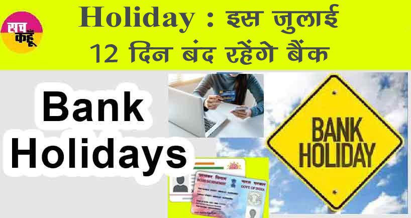 अब आरबीआई (RBI) ने अपने बैंक के छुट्टियों (Bank Holiday) के कैलेंडर के अनुसार जुलाई में पूरे भारतवर्ष में 12 दिनों की छुट्टियों का ऐलान किया है। भारत के सबसे बड़े बैंक केंद्रीय बैंक आरबीआई ने राष्टÑीय, राज्यकीय, सांस्कृतिक व धार्मिक अनुष्ठान, परिचालन जरूरतों, सरकारी घोषणाओं तथा अन्य बैंकों के साथ समन्वय जैसे कारकों पर विचार करते हुए पूरे वर्ष के अवकाशों की पूरी सूची जारी की है।