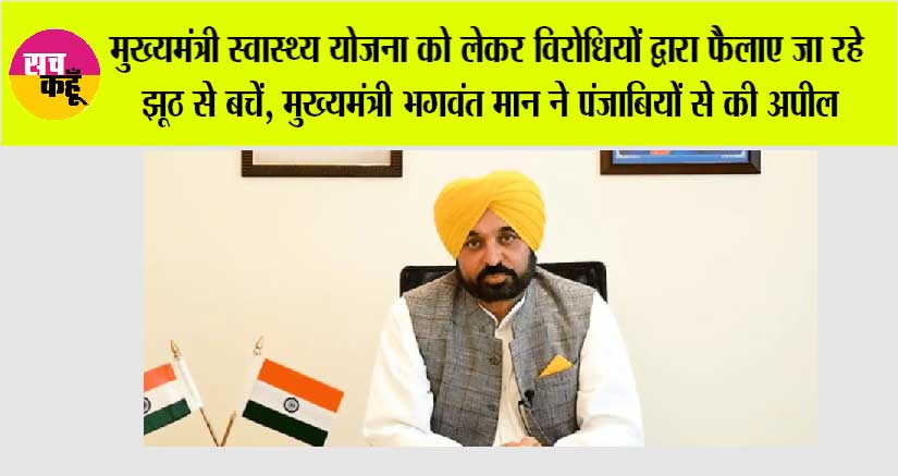 चंडीगढ़। पंजाब के मुख्यमंत्री भगवंत सिंह मान ने आज पंजाबवासियों से अपील की कि राज्य सरकार द्वारा हर परिवार के लिए शुरू की गई ‘मुख्यमंत्री सेहत योजना’ के बारे में पंजाब विरोधी ताकतों द्वारा किए जा रहे दुष्प्रचार से गुमराह न हों। एक वीडियो संदेश के माध्यम से लोगों को संबोधित करते हुए भगवंत सिंह मान ने कहा, “पंजाब सरकार ने लोक भलाई वाली इस प्रमुख योजना की शुरुआत की है ताकि पंजाब के हर नागरिक, खास तौर पर समाज के कमजोर वर्गों को कैशलेस इलाज तक सीधी पहुंच मिल सके।”