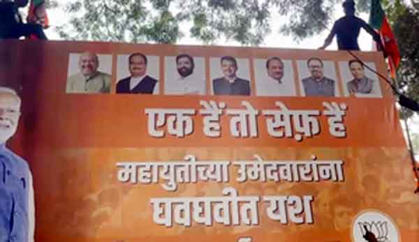 वहीं, आज जब चुनावी नतीजों की घोषणा हो रही है, तो इस घोषणा में जहां एक तरफ महायुति जीत की ओर अग्रसर है, तो दूसरी तरफ महाविकास अघाड़ी की उम्मीदों पर पानी फिर गया है। इसे लेकर पार्टी में चिंतन मंथन का सिलसिला शुरू हो चुका है। इस बीच, महाराष्ट्र में भाजपा कार्यालय के सामने प्रधानमंत्री नरेंद्र मोदी का पोस्टर लगाया गया है। इसमें प्रधानमंत्री द्वारा दिया गया नारा ‘एक रहेंगे तो सेफ रहेंगे’ लिखा हुआ है। इस पोस्टर ने महाराष्ट्र में राजनीतिक हलचल बढ़ा दी है।