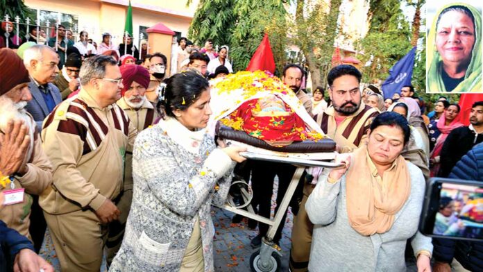 डेरा सच्चा सौदा प्रबंधकीय कमेटी सदस्यों, शाह सतनाम जी पुरा, एमएसजी कॉम्पलेक्स की साध-संगत, शाह सतनाम जी स्पेशेलिटी हॉस्पिटल के डॉक्टर्स और स्टाफ सदस्यों ने माता जगदेव कौर इन्सां को श्रद्धांजलि अर्पित की। डेरा सच्चा सौदा की बेटा-बेटी एक समान मुहिम के तहत माता जगदेव कौर इन्सां की अर्थी को उनकी बेटी संदीप कौर, बहु डॉ. गुरदीप कौर, एडवोकेट गुरप्रीत कौर, पोती आलम व अंबर ने कंधा दिया। इसके पश्चात ‘जब तक सूरज चांद रहेगा जगदेव कौर इन्सां तेरा नाम रहेगा’ जैसे गगनभेदी नारों के साथ पार्थिव देह को फूलों से सजी एंबुलेंस में श्री कृष्ण आयुष यूनिवर्सिटी, उमरी रोड़, कुरुक्षेत्र के लिए रवाना किया गया। Body Donation