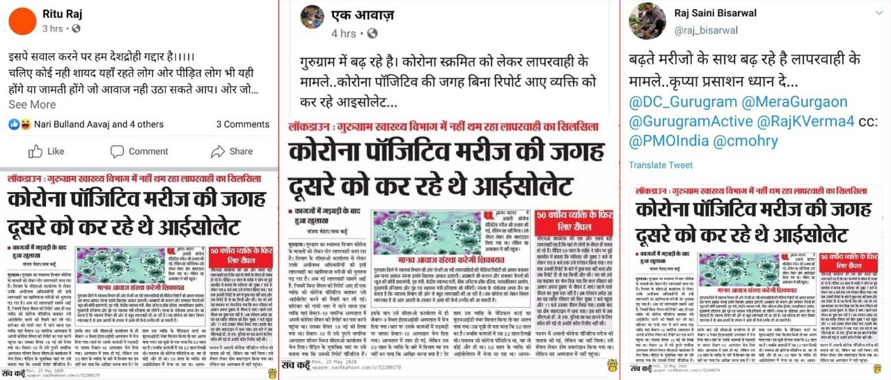 ‘कोरोना पॉजिटिव मरीज की जगह दूसरे को कर रहे थे आईसोलेट।’ इस शीर्षक से सोमवार 25 मई 2020 के सच कहूँ के अंक में खबर प्रकाशित हुई। इस खबर को सामाजिक संस्थाओं, कुछ जिम्मेदार लोगों ने भी अपने ट्वीटर हैंडल, फेसबुक व अन्य सोशल मीडिया प्लेटफार्म पर खूब वायरल किया। साथ ही जिला के स्वास्थ्य विभाग की कार्यप्रणाली पर सवाल उठाए। सामाजिक कार्यकर्ता राजकुमार सैनी (राज सैनी बिसरवाल) ने अपने ट्वीट में लिखा कि बढ़ते मरीजों के साथ बढ़ रहे हैं लापरवाही के मामले, कृपया प्रशासन ध्यान दे। उन्होंने इस खबर को गुरुग्राम के डीसी, मेरा गुडगांव संस्था, गुरुग्राम एक्टिव, राज के. वर्मा समेत प्रधानमंत्री कार्यालय और मुख्यमंत्री कार्यालय के ट्वीटर अकाउंट पर ट्वीट किया। शिव सेना के रितु राज ने खबर को फेसबुक पर शेयर करते हुए लिखा कि-इसपे सवाल करने पर हम देशद्रोही गद्दार हैं। चलिए कोई नहीं शायद यहां रहते लोग और पीड़ित लोग भी यही होंगे या जमाती होंगे। एक आवाज संस्था ने फेसबुक पर खबर शेयर करके लिखा है कि-गुरुग्राम में बढ़ रहे हैं कोरोना संक्रमित को लेकर लापरवाही के मामले। कोरोना पॉजिटिव की जगह बिना रिपोर्ट आए व्यक्ति को कर रहे आईसोलेट। इनके अलावा भी बहुत लोगों को खबर को ट्वीट, शेयर किया है। फेसबुक, ट्वीटर पर लोगों ने स्वास्थ्य विभाग को आड़े हाथों लिया है।