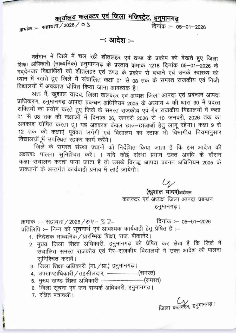 जिला कलक्टर एवं जिला आपदा एवं प्रबंधन आपदा प्राधिकरण, हनुमानगढ़ अध्यक्ष डॉ. खुशाल यादव ने आपदा प्रबंधन अधिनियम 2005 के अध्याय 4 की धारा 30 में प्रदत्त शक्तियों का प्रयोग करते हुए जिले के सभी राजकीय एवं गैर राजकीय विद्यालयों में कक्षा 1 से 8 तक की कक्षाओं में 6 जनवरी से 10 जनवरी तक का अवकाश घोषित किया है। यह अवकाश केवल छात्र-छात्राओं के लिए लागू रहेगा।