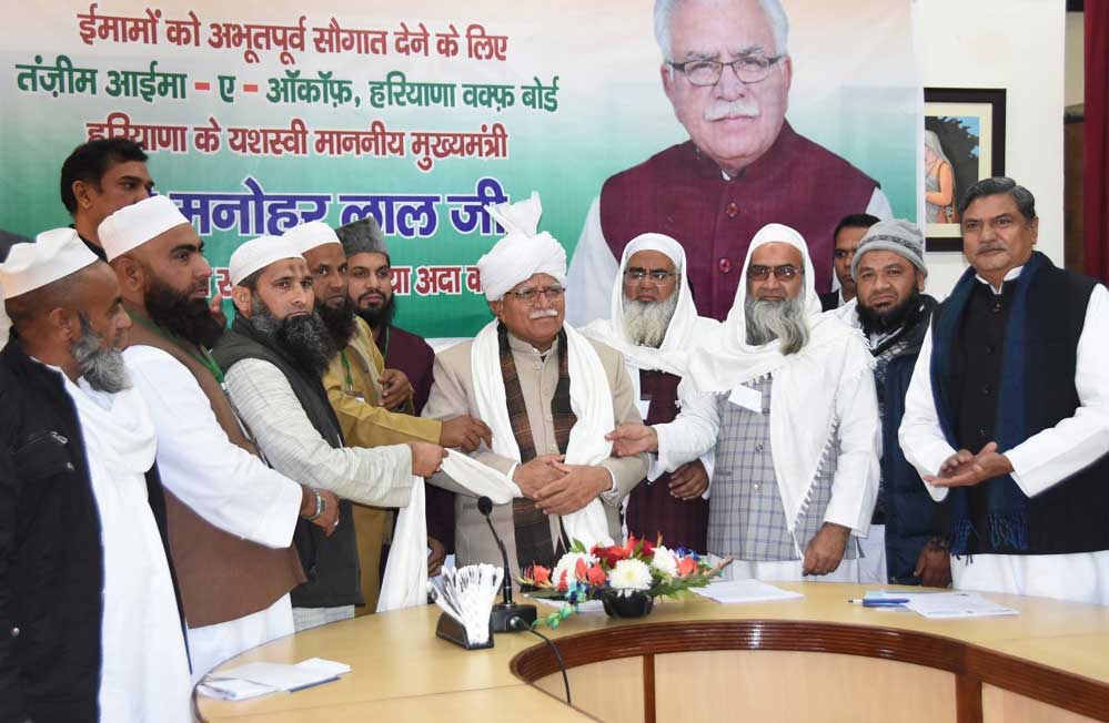 ईमामों को अभूतपूर्व सौगात देने के लिए तंजीम आईमा-ए-आॅकाफ हरियाणा वक्फ बोर्ड द्वारा मुख्यमंत्री मनोहर लाल का सम्मान समारोह गुरुग्राम विश्वविद्यालय में आयोजित किया गया था। इस कार्यक्रम की शुरूआत मुख्यमंत्री ने सलाम वालेकुम के संबोधन के साथ की और कार्यक्रम में उपस्थित सभी 25 ईमामों का परिचय लिया। कार्यक्रम में बताया गया कि मुख्यमंत्री मनोहर लाल ने हरियाणा वक्फ बोर्ड के ईमामों के वेतन में लगभग 50 प्रतिशत से ज्यादा वृद्धि की है, जिसके लिए बोर्ड से जुड़े ईमामों ने मुख्यमंत्री का आभार व्यक्त करने के लिए इस कार्यक्रम का आयोजन किया था। वक्फ बोर्ड से जुड़े ईमाम के वेतन में 5000 रुपये तक की बढ़ोत्तरी की गई है। हर साल 5 प्रतिशत वृद्धि का प्रावधान किया गया है।