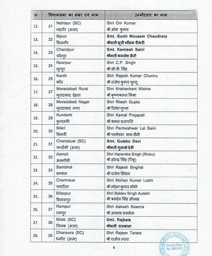 लखनऊ (एजेंसी)। उत्तर प्रदेश में विधानसभा चुनाव की रणभेरी बजने के बाद सभी सियासी दल अपने-अपने प्रत्याशियों की सूची जारी करने में जुटे हैं। कांग्रेस, सपा-रालोद गठबंधन और बसपा पहले प्रत्याशी घोषित कर चुके हैं। अब भाजपा ने पहले चरण के 58 में से 57 तथा दूसरे चरण की 55 में से 48 सीटों पर उम्मीदवारों का ऐलान कर दिया है। इसके साथ ही पार्टी ने कुल 105 सीटों पर उम्मीदवार घोषित कर दिए। इस सूची के अनुसार मुख्यमंत्री योगी आदित्यनाथ गोरखपुर शहर तथा डिप्टी सीएम केशव प्रसाद मौर्य को प्रयागराज के सिराथू से प्रत्याशी घोषित किया गया है।