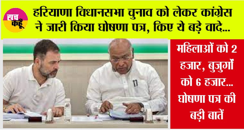 चंडीगढ़ (सच कहूँ न्यूज)। Haryana Vidhansabha Election: कांग्रेस ने हरियाणा के मतदाताओं से वादा करते हुए आज सात गारंटी देने की घोषणा की और कहा कि राज्य में यदि कांग्रेस की सरकार बनती है तो पार्टी अपने इन वादों को पूरा करेगी। कांग्रेस अध्यक्ष मल्लिकार्जुन खडगे ने इन वादों की घोषणा करते हुए आज यहां पार्टी मुख्यालय में संवाददाता सम्मेलन में कहा कि जब हरियाणा में कांग्रेस की सरकार थी तो पूरे देश में खेल, कृषि, इन्फ्रास्ट्रक्चर और प्रति व्यक्ति निवेश में हरियाणा नंबर एक पर था। इस बार हमारा संकल्प है कि यदि राज्य में कांग्रेस की सरकार बनती हे तो फिर से हरियाणा को नंबर एक राज्य बनाएंगे।
