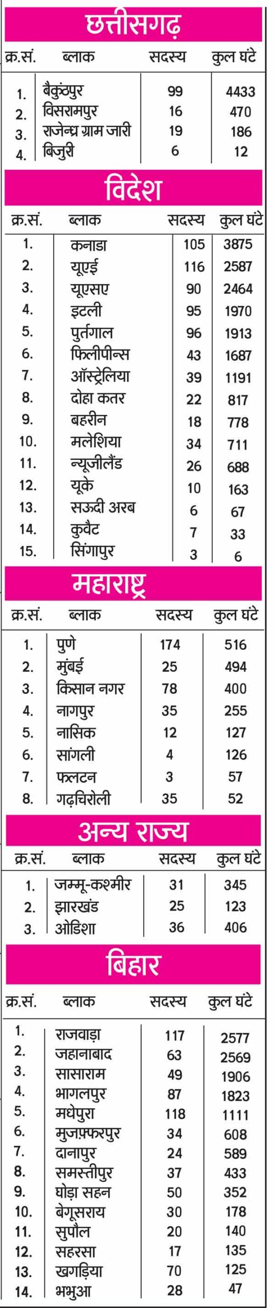 सरसा (सच कहूँ न्यूज)। Akhand Sumiran: डेरा सच्चा सौदा की साध-संगत के बीच निरंतर चल रहे अंखड सुमिरन मुकाबले में इस बार 1 फरवरी से 28 फरवरी 2025 के बीच दुनियाभर के 417 ब्लॉकों के 1,69,352 सेवादारों ने 27,99,300 घंटे रामनाम का जाप कर सृष्टि की भलाई और सुख शांति के लिए सच्चे सतगुरु से अरदास की। अखंड सुमिरन मुकाबले में विजेता की बात करें तो एक बार फिर हरियाणा के फतेहाबाद जिले का टोहाना ब्लॉक प्रथम रहा। इस ब्लॉक के 49,662 सेवादारों ने 3,01,913 घंटे सुमिरन किया है। जबकि दूसरा स्थान भी हरियाणा के ही ब्लॉक ने हासिल किया। जिसमें रतिया ब्लॉक के 3517 डेरा श्रद्धालुओं ने 1,52,814 घंटे अंखड सुमिरन कर दूसरा और पंजाब के संगरूर ब्लॉक के 2,488 सेवादारों ने 1,17,901 घंटे रामनाम का जाप कर तीसरा स्थान प्राप्त किया। टॉप-10 सूची में 7 ब्लॉक हरियाणा और 3 ब्लॉक पंजाब के शामिल हैं। Akhand Sumiran