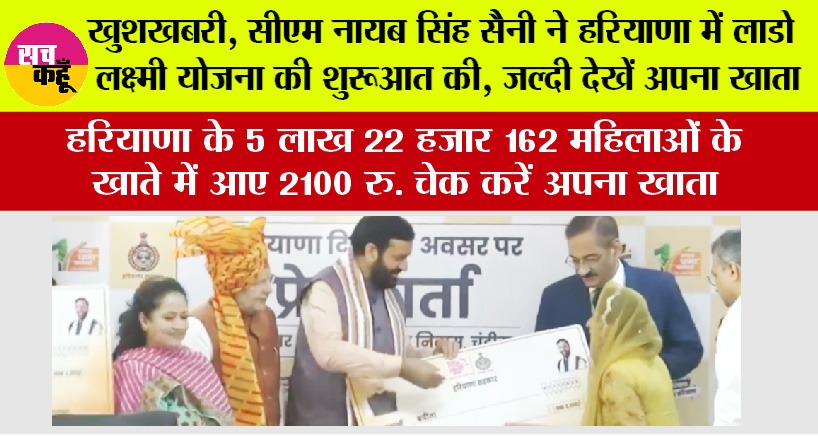 चंडीगढ़ (सच कहूँ न्यूज)। Haryana Lado Lakshmi Yojana: हरियाणा सरकार ने राज्य की महिलाओं को आत्मनिर्भर और आर्थिक रूप से सशक्त बनाने के उद्देश्य से ‘दीनदयाल लाडो लक्ष्मी योजना’ की शुरूआत की है। मुख्यमंत्री नायब सिंह सैनी द्वारा घोषित यह योजना महिलाओं के जीवन में एक नई आर्थिक स्थिरता और सम्मान की भावना लाने की दिशा में एक बड़ा कदम है। 5 लाख 22 हजार 162 महिलाओं के खाते में पैसे भेज दिए गए हैं। Haryana