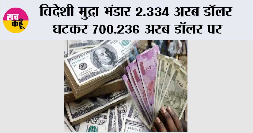 मुंबई (एजेंसी)। देश का विदेशी मुद्रा भंडार 26 सितंबर को समाप्त सप्ताह में 2.334 अरब डॉलर घटकर 700.236 अरब डॉलर रह गया, हालांकि स्वर्ण भंडार लगातार पांचवें सप्ताह बढ़कर रिकॉर्ड स्तर पर पहुंच गया है। यह लगातार दूसरा सप्ताह है, जब विदेशी मुद्रा के देश के भंडार में गिरावट दर्ज की गयी है। इससे पहले, 19 सितंबर को समाप्त सप्ताह में 39.6 करोड़ डॉलर घटकर 702.57 अरब डॉलर रह गया था। भारतीय रिजर्व बैंक (आरबीआई) के शुक्रवार को जारी आंकड़ों के अनुसार, 26 सितंबर को समाप्त सप्ताह में विदेशी मुद्रा भंडार का सबसे बड़ा घटक विदेशी मुद्रा परिसंपत्ति 4.393 अरब डॉलर घटकर 581.757 अरब डॉलर पर आ गयी।