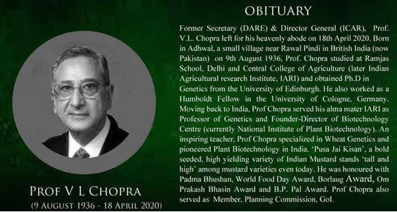 नयी दिल्ली। भारतीय कृषि अनुसंधान परिषद (आईसीएआर) के पूर्व महानिदेशक और योजना आयोग के पूर्व सदस्य वी एल चोपड़ा का कल यहां निधन हो गया। वह 84 वर्ष के थे। प्रो. चोपड़ा का जन्म नौ अगस्त 1936 को रावलपिंडी के निकट अधवाल गांव में हुआ था । उन्होंने दिल्ली के रामजस कालेज और सेन्ट्रल कालेज आफ एग्रीकल्चर में अध्ययन किया था। उन्होंने एडीनबर्ग विश्वविद्यालय से जेनेटिक्स (आनुवांशिकी) में पीएचडी की उपाधि हासिल की थी।