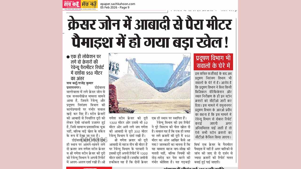 आपको बता दें कि यमुनानगर के उपमंडल छछरौली के डोईवाला और बल्लेवाला में लगे क्रशर जोन से एक सनसनीखेज मामला सामने आया था जिसको सच कहूं समाचार पत्र में प्रमुखता से प्रकाशित किया गया जिसमें रेवेन्यू और प्रदूषण नियंत्रण विभाग की कार्यप्रणाली पर सवाल खड़े कर दिए। खनन क्षेत्र बल्लेवाला और डोईवाला के आसपास स्टोन क्रशरों की आबादी से निर्धारित दूरी को लेकर ऐसी धांधली उजागर हुई है, जिसे सामान्य प्रशासनिक चूक नहीं, बल्कि बड़े खेल के संकेत के रूप में देखा जा रहा है। डोईवाला क्रशर जोन में एक ही स्थान पर आमने-सामने लगे दो क्रशर जय गणेश स्टोन क्रशर व श्री गणेश स्टोन क्रशर की दूरी को रेवेन्यू विभाग ने अपनी रिपोर्ट में अलग-अलग दर्शाया है।