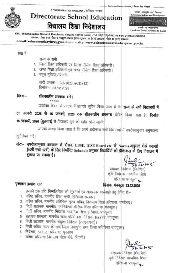 Haryana Winter School Holiday News: चंडीगढ़। हरियाणा शिक्षा विभाग ने प्रदेश के सभी सरकारी व निजी स्कूलों में 1 जनवरी से 15 जनवरी तक शीतकालीन अवकाश घोषित कर दिया है। यह फैसला सर्दी के बढ़ते प्रकोप और विद्यार्थियों के स्वास्थ्य को ध्यान में रखते हुए लिया गया है।