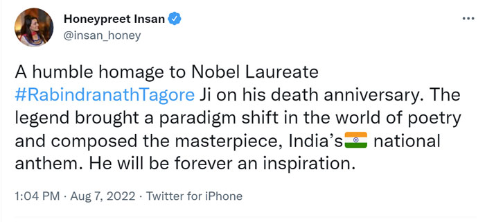 रवींद्रनाथ टैगोर की पुण्यतिथि पर साहिबजादी बहन हनीप्रीत इन्सां ने ट्वीट कर दी श्रद्धाजंलि