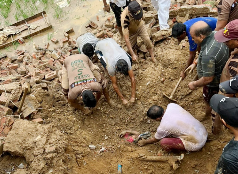 पातड़ा (भूषण सिंगला)। पटियाला में बीती रात से हो रही भारी बारिश से स्टेट बैंक आॅफ पटियाला जाखल रोड पातड़ां के नजदीक वार्ड नं. 9 में एक दर्दनाक हादसा घटित हो गया। यहां भारी बारिश होने से एक मकान जमींदोज हो गया। हादसे में एक ही परिवार के 5 सदस्य मकान गिरने के कारण मलबे के नीचे दब गए। हादसा इतना भयानक था कि परिवार के सभी सदस्य मलबे के नीचे पूरी तरह से दब गए, जो कि मलबे के नीचे दिखाई भी नहीं दे रहे थे। इस हादसे की सूचना जब डेरा सच्चा सौदा की शाह सतनाम जी ग्रीन एस वैल्फेयर फोर्स विंग के सेवादारों को मिली तो सेवादारों ने तुरंत घटनास्थल पर पहुंचकर प्रशासन की देखरेख में बचाव कार्य शुरू कर दिया और इस बचाव कार्य में प्रशासन के साथ आमजन ने भी पूरा सहयोग दिया।