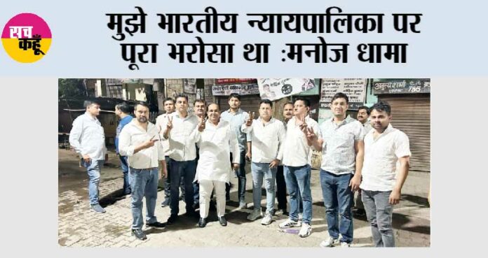 मनोज धामा ने कहा कि सत्य परेशान हो सकता है लेकिन पराजित नहीं मुझे व मेरे सभी भाइयों को भारतीय न्यायपालिका पर पूरा भरोसा था न्यायपालिका ने दूध का दूध, पानी का पानी करते हुए, एक महिला के जरिए लगाए गए झूठे गैंग रेप केस मामले में हम सभी को बरी किया है। उन्होंने कहा कि कई वर्षों से चल रहा है ये परेशानी का दौर अब खत्म हुआ है । हमे व हमारे परिवारों को न्याय मिला है।उन्होंने कहा कि हम माननीय कोर्ट का धन्यवाद करते हैं। और और समाज के एक बहुत बड़े वर्ग से गुज़ारिश करते हैं कि राजनीतिक कठपुतली बनकर किसी के भी परिवार को उजाड़ने के नियत से कोई भी गलत कार्य नहीं करना चाहिए। कभी भी किसी अच्छे और सच्चे व्यक्ति, उसके दामन पर कभी भी ग़लत आरोप नहीं लगाना चाहिए। ईश्वर सबका न्याय करते हैं। कोर्ट में जज की कुर्सी पर बैठे भगवान स्वरूप व्यक्ति सभी के साथ पूर्ण न्याय करते हैं। माननीय कोर्ट ने ये न्यायसंगत न्याय किया है ।
