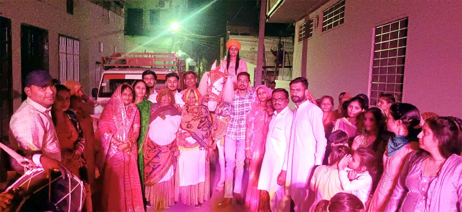 हनुमानगढ़। जंक्शन निवासी सरस्वती देवी धर्मपत्नी बनवारी लाल की पौत्री नीलम के विवाह पर उनकी बुआ मंजू सारस्वा व चाची इन्द्रा देवी ने समाज में बेटा-बेटी के भेद को समाप्त करने के उद्देश्य से नीलम को घोड़ी पर बैठाकर बिंदोरा निकाला। बुआ मंजू सारस्वा के टाउन की नई आबादी स्थित निवास से बिंदोरा निकालने के दौरान घर वालों ने खूब नाच-गाकर खुशियां मनाईं। Hanumangarh News