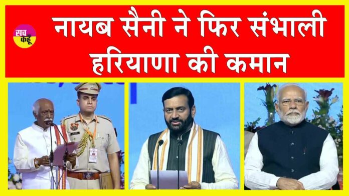 Nayab Saini Oath Taking Ceremony: चंडीगढ़ (एजेंसी)। कल नायब सिंह सैनी को भाजपा विधायक दल का नेता चुने जाने के बाद आज गुरुवार, 17 अक्तूबर को नायब सिंह सैनी ने प्रधानमंत्री नरेंद्र मोदी और अन्य शीर्ष नेताओं की मौजूदगी में दूसरी बार हरियाणा के मुख्यमंत्री पद की शपथ ली। Haryana News