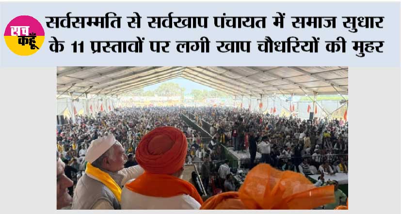 मुज़फ्फरनगर (सच कहूँ न्यूज़)। ऐतिहासिक सर्वखाप मुख्यालय गांव सोरम (शौरौं) में 15 वर्षों बाद आयोजित 16 से 18 नवम्बर 2025 तक चले तीन दिवसीय सर्वजातीय सर्वखाप पंचायत के 7 वें महासम्मेलन का भव्य समापन समाज सुधार से जुड़े 11 प्रमुख प्रस्तावों के पारित होने के साथ हुआ। देश–प्रदेश के विभिन्न क्षेत्रों से आए खाप चौधरी, सामाजिक प्रतिनिधि व गणमान्य लोगों की मौजूदगी में सर्वसम्मति से ये प्रस्ताव पारित किए गए। पंचायत ने विभिन्न सामाजिक मुद्दों, कुरीतियों और बदलते सामाजिक वातावरण पर व्यापक चर्चा के बाद इन प्रस्तावों को “समाजहित में आवश्यक कदम” बताते हुए लागू करने की अपील की।सर्वखाप मंत्री सुभाष बालियान ने प्रस्तावों को पढ़कर सुनाया।