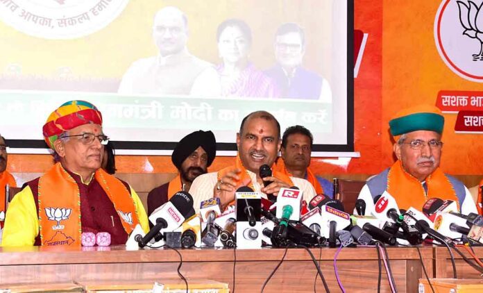 प्रेसवार्ता को संबोधित करते हुए भाजपा प्रदेशाध्यक्ष सीपी जोशी (CP Joshi) ने कहा कि विगत 04 अक्टूबर को भाजपा के राष्ट्रीय अध्यक्ष जेपी नड्डा ने ”आपणो राजस्थान सुझाव आपका, संकल्प हमारा’ कार्यक्रम का शुभारंभ किया था। इस कार्यक्रम के तहत प्रदेश के 200 विधानसभा क्षेत्रों में 51 रथ भेजे गए थे, जिनमें 8000 आकांक्षा पेटियां सुझाव के लिए रखी गई थी। इस कार्यक्रम के तहत प्रदेश में 5650 चौपालें आयोजित की गई और 2300 सम्मेलन भी आयोजित हुए। इस दौरान किसान, मजदूर, व्यापारी वर्ग सहित सभी वर्ग के लोगों ने बढ़-चढ़कर इस कार्यक्रम में भाग लिया। प्रदेश की जनता को विश्वास है कि भाजपा की कथनी और करनी में कोई फर्क नहीं है, प्रधानमंत्री नरेन्द्र मोदी जो वादा करते हैं उसे पूरा करके दिखाते हैं।