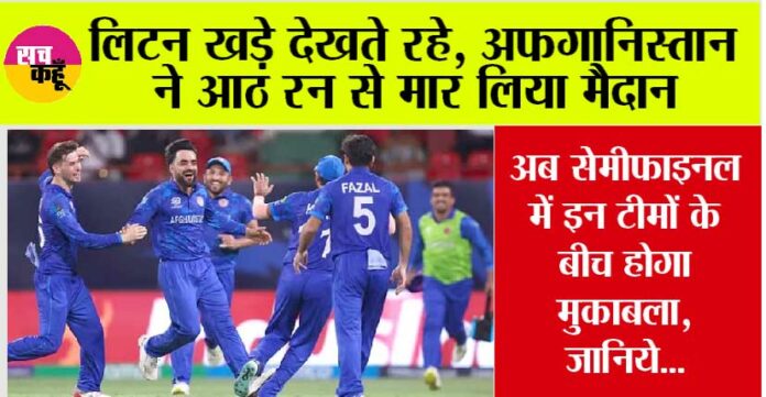 AFG vs BAN: किंग्सटाउन (एजेंसी)। टी-20 विश्वकप के सुपर आठ ग्रुप एक में बंगलादेश के सलामी बल्लेबाज लिटन कुमार दास नाबाद (54) खड़े देखते रहे और राशिद खान की अगुवाई वाली अफगानिस्तान टीम के गेंदबाजों ने इतिहास रचते हुए आठ रन से वर्षा बाधित मुकाबले को जीतकर सेमीफाइनल में प्रवेश किया। अफगानिस्तान के कप्तान राशिद खान और नवीन उल हक ने बेहतरीन गेंदबाजी का मुजाहिरा करते हुए चार-चार विकेट चटकाते हुए बंगलादेश को 17.5 ओवर में 105 रन पर ढ़ेरकर मुकाबला जीतकर आॅस्ट्रेलिया को भी विश्वकप से बाहर कर दिया है। बंगलादेश के लिटन कुमार दास एक छोर थामे खड़े रहे लेकिन किसी भी बल्लेबाज ने उनका साथ नहीं दिया। उन्होंने 49 गेंदों में पांच चौके और एक छक्के की मदद से नबाद (54) रनों की पारी खेली। मैच के बीच में बारिश होने के कारण डकवर्थ लुईस नियम के तहत बंगलादेश का एक ओर घटाकर 19 ओवर में संशोधित लक्ष्य दिया गया था। वहीं अब भारत का मुकाबला सेमीफाइनल में अब इंग्लैंड से होगा। वहीं, अफगानिस्तान अफ्रीका से भिड़ेगा।