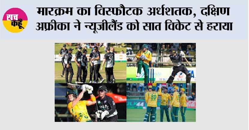 अहमदाबाद (एजेंसी)। मार्को यानसन (चार विकेट) के बाद कप्तान एडन मारक्रम (नाबाद 86 ) की शानदार विस्फोटक बल्लेबाजी की बदौलत दक्षिण अफ्रीका ने शनिवार को टी-20 विश्वकप के 24वें मुकाबले में न्यूजीलैंड को 17 गेंदे शेष रहते 7 विकेट से शिकस्त दी। मार्को यानसन को ‘प्लेयर आॅफ द मैच’ के पुरस्कार से नवाजा गया। 176 रनों के लक्ष्य का पीछा करने उतरी दक्षिण अफ्रीका के लिए एडन मारक्रम और क्विंटन डी कॉक की सलामी जोड़ी अच्छी शुरूआत करते हुए पहले विकेट के लिए 62 रन जोड़े। पांचवें में लॉकी फर्ग्युसन ने क्विंटन डी कॉक 14 गेंदों में (20) को आउट कर इस साझेदारी को तोड़ा। रायन रिकलटन 11 गेंदों में (21) और डेवाल्ड ब्रेविस 17 गेंदों में 21 रन बनाकर आउट हुये। दक्षिण अफ्रीका ने 17.3 ओवर में तीन विकेट पर 178 रन बनाकर मुकाबला सात विकेट से अपने नाम कर लिया। एडन मारक्रम ने 44 गेंदों में आठ चौके और चार छक्के उड़ाते हुए नाबाद 86 रनों की मैच विजयी पारी खेली। डेविड मिलर ने 17 गेंदों में नाबाद 24 रन बनाये। डेविड मिलर ने 18वें ओवर की पहली गेंद पर छक्का लगाकर अपनी टीम को जीत दिलाई।