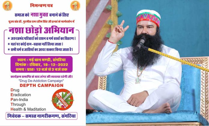पूज्य गुरु संत डा. गुरमीत राम रहीम सिंह जी इन्सां ने गत 3 नवंबर को शाह सतनाम जी आश्रम बरनावा, यूपी से लाइव कार्यक्रम दौरान अखिल भारतीय नशामुक्त अभियान की शुरूआत की, जिसको ड्रग इरेडीकेशन पेन-इंडिया थ्रू हैल्थ एंड मैडिटेशन का नाम दिया गया। ध्यान, योग एवं स्वास्थ्य द्वारा अखिल भारतीय नशामुक्ति अभियान का मूल उद्देश्य हिंदुस्तान से नशे को जड़ से खत्म करना है। इस अभियान को कारगर बनाने के लिए डेरा सच्चा सौदा गांव, कस्बे व शहरी स्तर पर स्थानीय साध-संगत का सहयोग लेगा। ग्रामीण व शहरी क्षेत्रों में जागरूकता कैंपों के अलावा योग एवं ध्यान क्रियाओं के जरीये लोगों को नशा छोड़ने के लिए प्र्रेरित किया जाएगा, वहीं स्वास्थ्य कैंप भी लगाए जाएंगे जिनमें नशे के आदि लोगों का उपचार भी किया जाएगा।