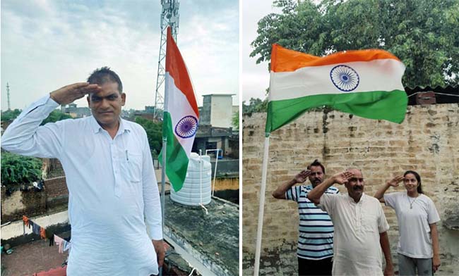 रानियां (राजेन्द्र गाबा)। पूज्य गुरु संत डॉ. गुरमीत राम रहीम सिंह जी इन्सां द्वारा मानवता भलाई के 142 कार्य चलाए जा रहे हैं। इसी कड़ी में ब्लॉक रानियां-चामल की साथ-संगत बड़े मान व सम्मान के साथ अपने घरों की छतों पर तिरंगा फहरा रही है और तिरंगा फहराने के बाद तिरंगे को सैल्यूट भी कर रही है। गांव सुलतानपुरियां के भजन लाल इन्सां, सतनाम इन्सां व गांव मंगाला के बनवारी लाल इन्सां ने अपने परिवार के सदस्यों के साथ अपने मकान की छत पर बड़े मान सम्मान से तिरंगा फहराया और परिवार के सभी सदस्यों ने तिरंगा को सैल्यूट भी किया।