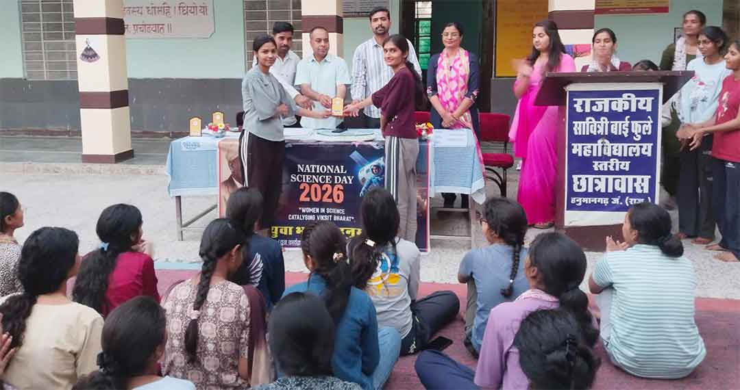 National Science Day 2026: हनुमानगढ़। युवा कार्यक्रम एवं खेल मंत्रालय, भारत सरकार के माय भारत केन्द्र हनुमानगढ़ के तत्वाधान में नेहरू युवा मंडल की ओर से राजकीय सावित्री बाई फुले महाविद्यालय स्तरीय छात्रावास में राष्ट्रीय विज्ञान दिवस का आयोजन किया गया। कार्यक्रम में छात्राओं ने हिस्सा लिया और विज्ञान के प्रति अपनी रचनात्मकता एवं वैज्ञानिक सोच का परिचय दिया। कार्यक्रम के मुख्य अतिथि सामाजिक न्याय एवं अधिकारिता विभाग के उपनिदेशक विक्रम सिंह शेखावत एवं आरएएस अधिकारी प्रदीप सहारण रहे। अतिथियों ने विज्ञान दिवस पर छात्राओं द्वारा तैयार किए गए 10 मॉडलों का अवलोकन किया। सभी मॉडल विभिन्न महान वैज्ञानिकों के जीवन एवं उनके योगदान पर आधारित थे, जिनकी अतिथियों ने सराहना की। Hanumangarh News
