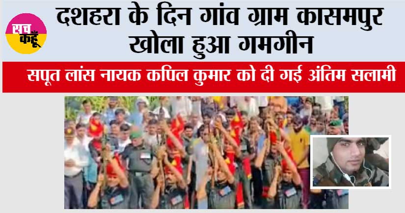 मीरापुर।(सच कहूं/कोमल प्रजापति) क्षेत्र का ग्राम कासमपुर खोला उस समय गमगीन हो गया जब गांव के सपूत लांस नायक कपिल कुमार (28 वर्ष) का पार्थिव शरीर गुरुवार को गांव पहुंचा। जाट रेजीमेंट में की टुकडी ने आकर कपिल के अंतिम संस्कार में उनके सम्मान में अंतिम सलामी दी।
