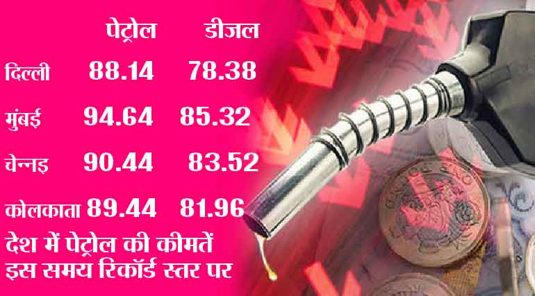 नई दिल्ली (सच कहूँ न्यूज)। पेट्रोल और डीजल के दाम शुक्रवार को लगातार चौथे दिन फिर से बढ़ गये। देश में पेट्रोल की कीमतें इस समय रिकॉर्ड स्तर पर हैं। दिल्ली को छोड़कर अन्य शहरों में डीजल के दाम भी ऐतिहासिक उच्चतम स्तर पर हैं। घरेलू बाजार में सबसे बड़ी तेल विपणन कंपनी इंडियन आॅयल कॉपोर्रेशन के अनुसार, राष्ट्रीय राजधानी दिल्ली में पेट्रोल आज 29 पैसे महँगा हुआ और इसकी कीमत 88.14 रुपये प्रति लीटर पर पहुंच गई। मुंबई में पेट्रोल 28 पैसे बढ़कर 94.64 रुपये हो गया जबकि कोलकाता में 28 पैसे बढ़कर इसकी कीमत 89.44 रुपये प्रति लीटर हो गई।