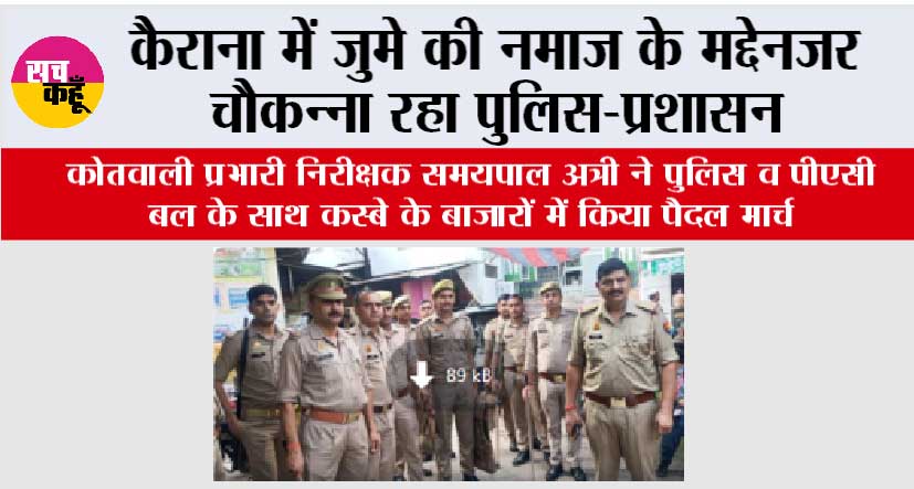 कैराना। कैराना में जुमे की नमाज पुलिस-प्रशासन की सतर्कता के चलते शांतिपूर्ण ढंग से संपन्न हो गई। इस दौरान पुलिस-प्रशासन पूरी तरह अलर्ट दिखाई दिया। वहीं, कोतवाली प्रभारी निरीक्षक ने सुरक्षा-व्यवस्था के दृष्टिगत कस्बे के बाजारों में पैदल मार्च किया।