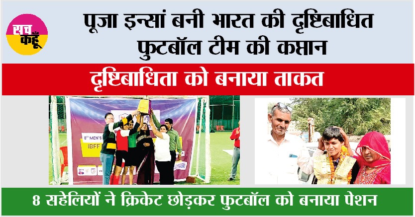तोशाम (सच कहूँ/विरेंद्र सिंह)। Tosham News: कहते हैं, अगर हौसले बुलंद हों तो कोई भी बाधा मंजिल तक पहुंचने से नहीं रोक सकती। इस कहावत को सच कर दिखाया है गांव डाडम की बेटी पूजा इन्सां ने दृष्टिबाधिता जैसी चुनौती के बावजूद पूजा ने हार नहीं मानी और आज वह भारतीय दृष्टिबाधित महिला फुटबॉल टीम की कप्तान बनकर देश, प्रदेश और अपने गांव का नाम रोशन कर रही हैं। पूजा इन्सां बचपन से ही दृष्टिबाधित हैं, लेकिन उन्होंने अपनी इस कमजोरी को कभी अपनी राह में रुकावट नहीं बनने दिया। Tosham News