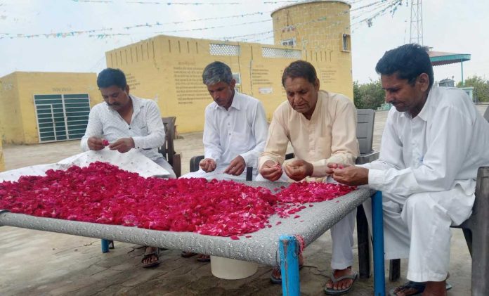 राजू, ओढां। गुलकंद को गर्मियों का तोहफा कहा जाता है। इन दिनों गुलाब के पौधों पर फूलों की खूब भरमार देखी जा रही है। डेरा सच्चा सौदा सरसा की शाखा साध बेला धाम आश्रम नुहियांवाली में सेवादार गुलकंद बनाने की सेवा में जुटे हैं। आश्रम के जीएसएम सेवादार रामलाल इन्सां ने बताया कि पूज्य गुरु संत डॉ. गुरमीत राम रहीम सिंह जी इन्सां के पावन आशीर्वाद से साध बेला धाम आश्रम पूरे जिला में गुलकंद व अमरूद के लिए मशहूर है। स्थानीय लोगों के अलावा दूर-दराज के लोग भी यहां का गुलकंद व अमरूद बड़े चाव से खरीदने आते हैं। आश्रम में गुलकंद बनाने के लिए गुलाब के फूलों की सफाई करते सेवादार।