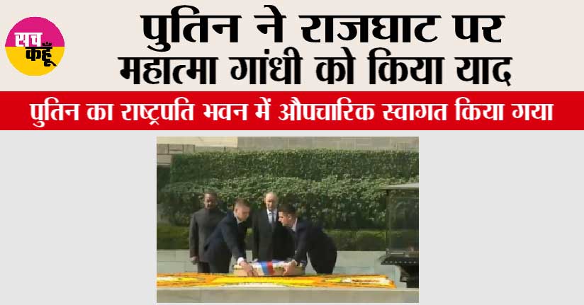 Russian Vladimir Putin India: नई दिल्ली। भारत यात्रा पर आए रूसी राष्ट्रपति व्लादीमीर पुतिन ने शुक्रवार को राजघाट जाकर महात्मा गांधी को श्रद्धासुमन अर्पित किए। पुतिन ने बापू की समाधि पर सिर झुकाया और परिक्रमा की। उन्होंने एक पुष्प चक्र चढ़ाया और बापू के प्रति अपनी कृतज्ञता प्रकट की। उन्होंने राजघाट पर रखी स्मारिका में भी दस्तखत किए। पुतिन भारत की दो दिवसीय यात्रा पर आए हुए हैं। इससे पहले उनका राष्ट्रपति भवन में औपचारिक स्वागत किया गया और उन्हें सलामी गारद दी गयी। पुतिन का आज शाम सात बजे भारत से रवाना होने का कार्यक्रम है।
