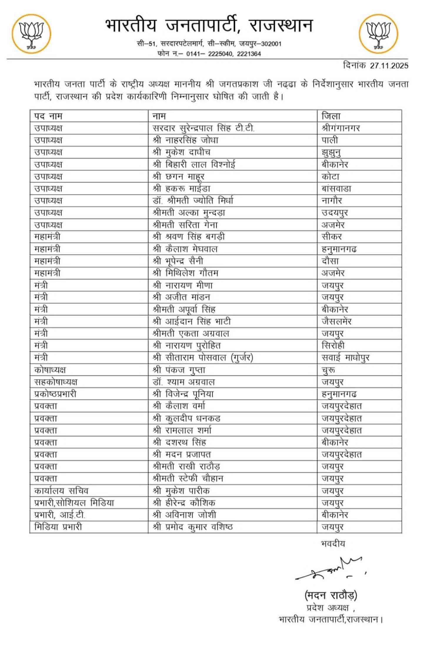 Rajasthan BJP State Executive Announced: राजस्थान भाजपा प्रदेश कार्यकारिणी घोषित, सुरेंद्र पाल सिंह टीटी बने उपाध्यक्ष