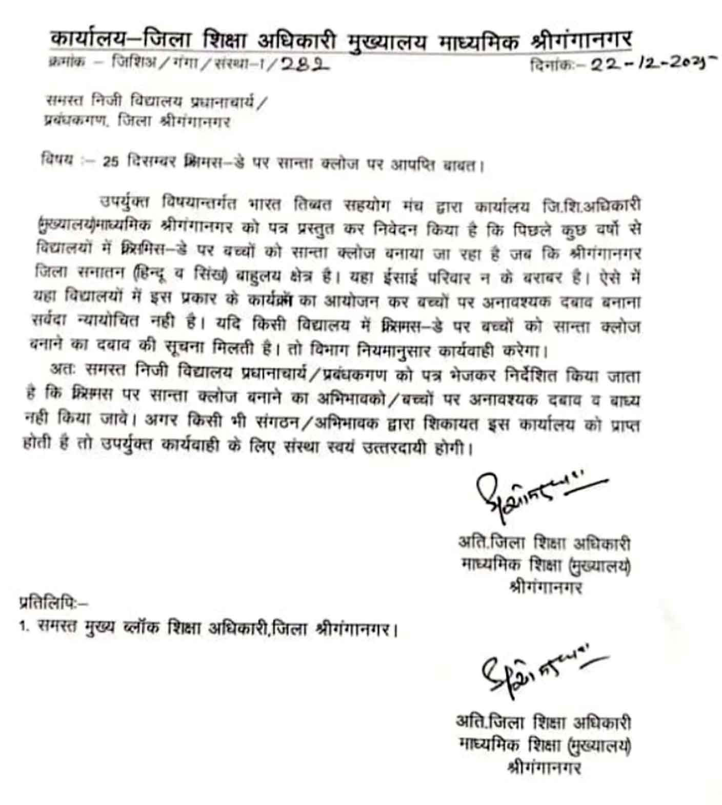 अतः समस्त निजी विद्यालय प्रधानाचार्य/ प्रबंधकगण को पत्र भेजकर निर्देशित किया जाता है कि क्रिसमस डे पर सान्ता क्लोज बनाने का अभिभावको/बच्चों पर अनावश्यक दबाव व बाध्य नहीं किया जाये। अगर किसी भी संगठन / अभिभावक द्वारा शिकायत इस कार्यालय को प्राप्त होती है तो उपर्युक्त कार्यवाही के लिए संस्था स्वयं उत्तरदायी होगी। Sri Ganganagar News