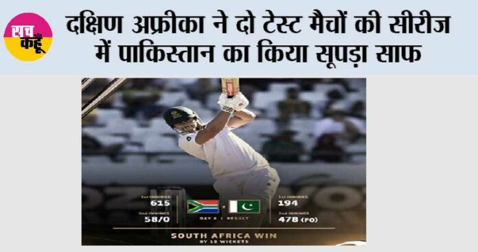 SA vs PAK: केपटाउन (एजेंसी)। कगिसो रबाड़ा, केशव महाराज (तीन-तीन विकेट) और मार्को यानसन (दो विकेट) के बाद डेविड बेडिंघम (नाबाद 44) रनों की शानदार पारी की बदौलत दक्षिण अफ्रीका ने दूसरे टेस्ट मैच के चौथे दिन पाकिस्तान को 10 विकेट से हरा दिया है। इसी के साथ दक्षिण अफ्रीका दो मैचों की श्रृंखला में पाकिस्तान का सूपड़ा साफ कर दिया है। दक्षिण अफ्रीका ने पाकिस्तान को दूसरी पारी में 478 के स्कोर पर समेटने के बाद मिले 58 रनों के लक्ष्य को बिना कोई विकेट खोए 7.1 ओवर में हासिल कर लिया। दूसरी पारी में बल्लेबाजी करने उतरी दक्षिण अफ्रीका की डेविड बेडिंघम और एडन मारक्रम की सलामी जोड़ी शानदार बल्लेबाजी का मुजाहिरा करते हुए तेजी के साथ रन बटोरे। डेविड बेडिंघम ने 30 गेंदों में चार चौके और दो छक्के लगाते हुये (नाबाद44) रन बनाये। वहीं एडन मारक्रम 13 गेंदों में (14) रन बनाकर नाबाद रहे। दक्षिण अफ्रीका ने दूसरी पारी में 61 रन बनाकर मुकाबला 10 विकेट से जीता। इसी के साथ दक्षिण अफ्रीका ने दो मैचों की सीरीज 2-0 से अपने नाम कर ली। दूसरे टेस्ट में 259 रनों की शानदार पारी खेलने वाले दक्षिण अफ्रीका के रायन रिकलटन को ‘प्लेयर आॅफ द मैच’ और सीरीज में 80 रन देकर 10 विकेट लेने वाले मार्को यानसन को ह्यप्लेयर आॅफ द सीरीजह्ण से नवाजा गया।