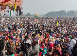 किसानों के जोश के सामने सात एकड़ में बना स्टेडियम छोटा पड़ गया और सड़क पर भी लंबा जाम लगा हुआ है।