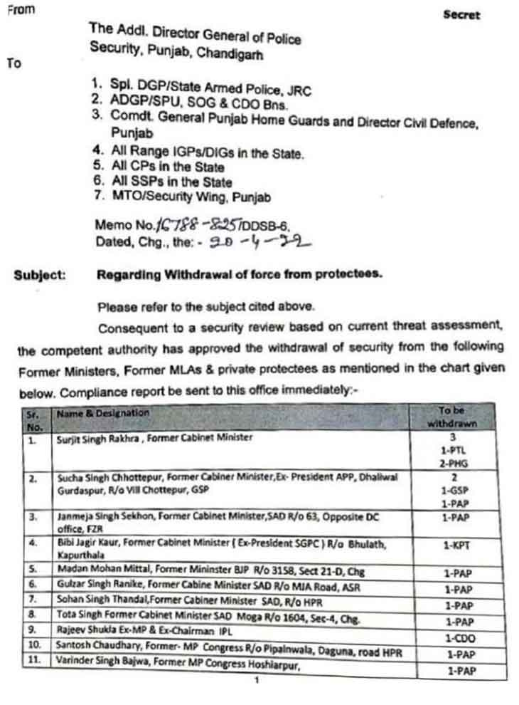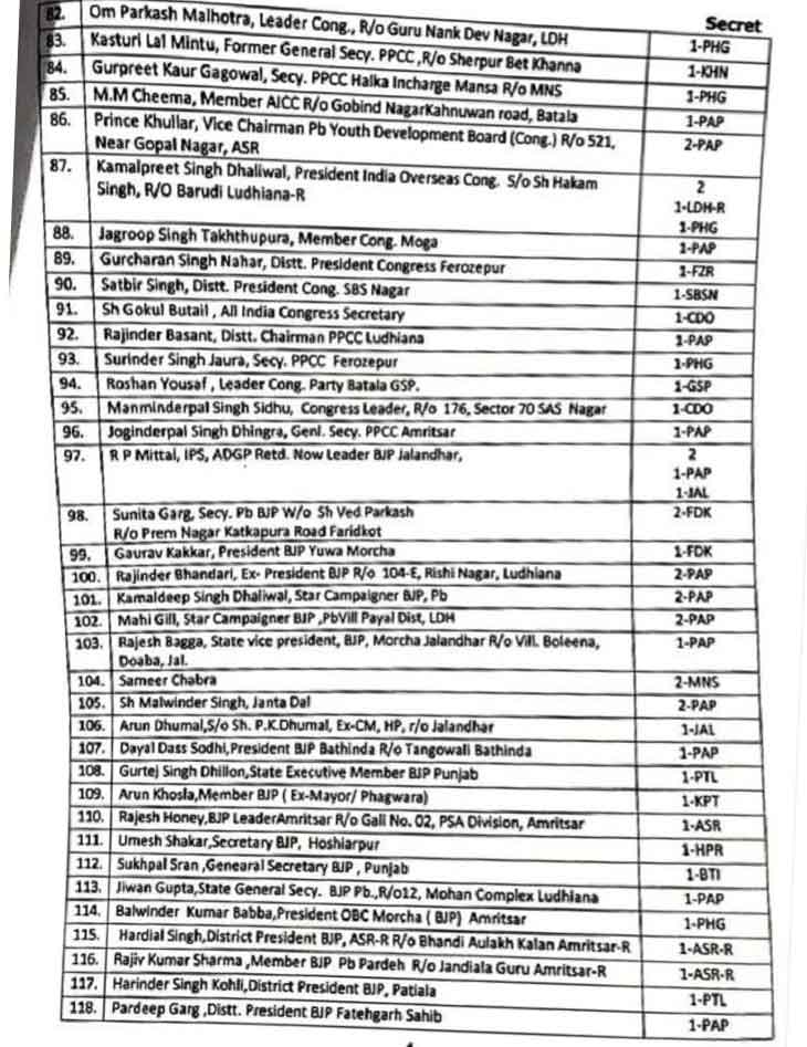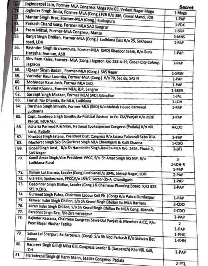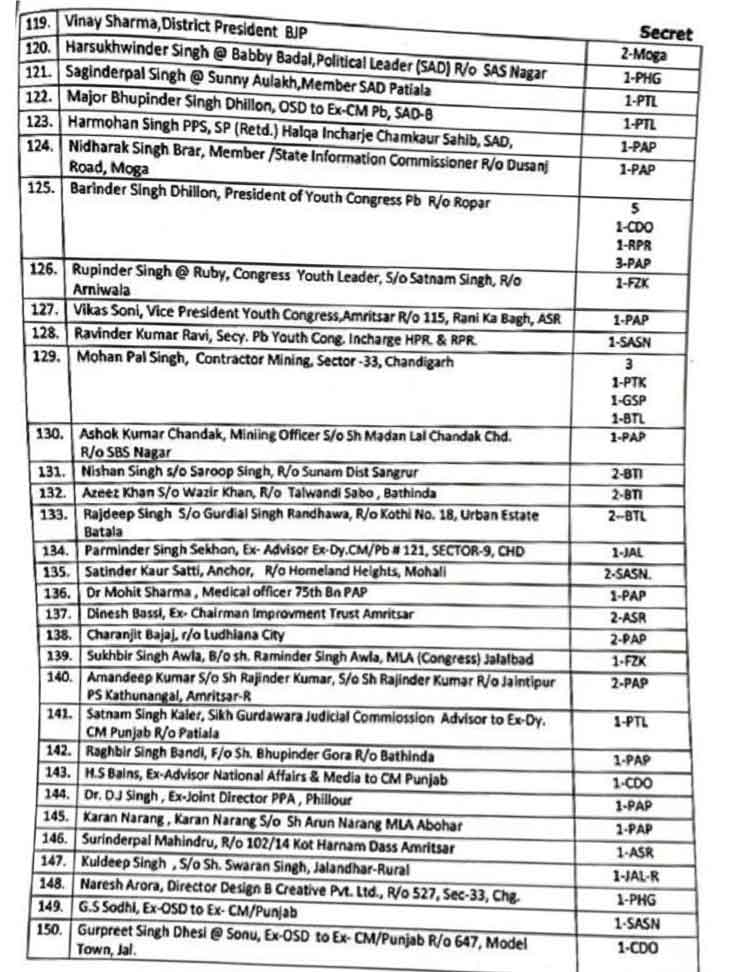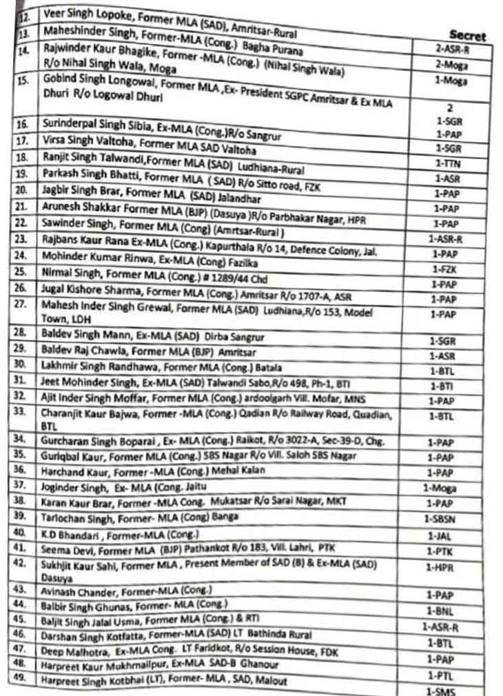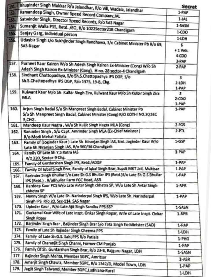 सूची में पंजाब के पूर्व डिप्टी सीएम सुखजिंदर सिंह रंधावा के बेटे उदयबीर सिंह रंधावा के पास सबसे ज्यादा 6 कर्मचारियों की सुरक्षा थी। इसके अलावा एक गाड़ी भी थी, जिसे अब वापिस लिया ले लिया गया है। पूर्व सीएम कैप्टन अमरिंदर सिंह के बेटे रणइंदर सिंह और मनप्रीत बादल के बेटे अर्जुन बादल के साथ पूर्व सीएम चरणजीत चन्नी के परिवार से भी सुरक्षा वापस ले ली गई है।
