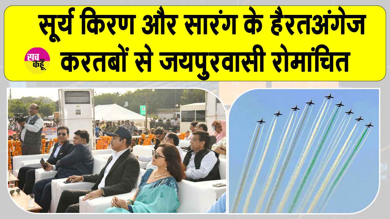 जयपुर। जयपुर में शुक्रवार को जल महल पर भारतीय वायु सेना के शौर्य, साहस और शौर्य का अद्भुत प्रदर्शन हुआ। भारतीय वायु सेना की प्रतिष्ठित ब्रांड एंबेसडर सूर्य किरण एरोबैटिक टीम और सारंग हेलिकॉप्टर डिस्प्ले टीम ने अपने हैरतअंगेज करतबों से हजारों दर्शकों को रोमांचित कर दिया। कार्यक्रम में कैबिनेट मंत्री कर्नल राज्यवर्धन सिंह राठौड़ की गरिमामयी उपस्थिति रही। उनके साथ प्रशासनिक अधिकारी, जनप्रतिनिधि, सेना के वरिष्ठ अधिकारी, एनसीसी कैडेट्स, स्कूली विद्यार्थी तथा बड़ी संख्या में आमजन मौजूद रहे। Jaipur News