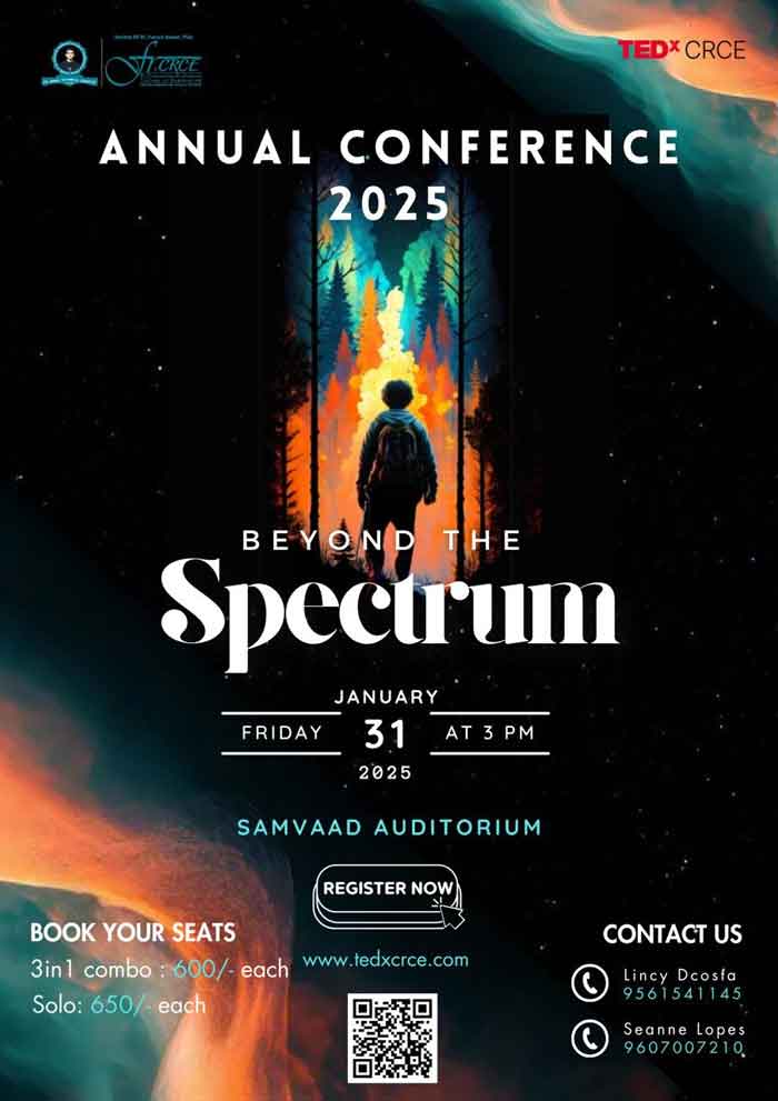 मुंबई (सच कहूँ न्यूज़)। TEDxCRCE: युवा मन में नयें विचारों की चिंगारी को प्रज्वलित करने और “आइडियाज़ वर्थ स्प्रेडिंग के अपने उद्देश्य को आगे बढ़ाने के लिए, फ्र. कॉसेसाओ रोड्रिग्स कॉलेज ऑफ इंजीनियरिंग का स्टूडेंट चैप्टर TEDxCRCE एक बार फिर से अपने 9वें वार्षिक सम्मेलन 2025 के साथ वापस आ रहा है। इवेंट प्रतिनिधि ने सच कहूँ संवाददाता को बताया कि यह कार्यक्रम 31 जनवरी, 2025 को संवाद ऑडिटोरियम में आयोजित किया जाएगा।
