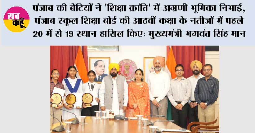 चंडीगढ़। पंजाब के मुख्यमंत्री भगवंत सिंह मान ने आज कहा कि पंजाब की ‘शिक्षा क्रांति’ ज़मीनी स्तर पर नतीजे दे रही है और आम परिवारों की बेटियों ने पंजाब स्कूल शिक्षा बोर्ड की आठवीं कक्षा की मेरिट लिस्ट में पहले 20 में से 19 स्थान हासिल करके दबदबा बना लिया है। चंडीगढ़ में अपने आवास पर शीर्ष विद्यार्थियों का सम्मान करते हुए मुख्यमंत्री भगवंत सिंह मान ने घोषणा की कि पहले 20 विद्यार्थियों को बिना किसी एडमिशन परीक्षा के स्कूल ऑफ एमिनेंस में सीधा प्रवेश दिया जाएगा, जिससे गुणवत्तापूर्ण शिक्षा तक पहुंच बढ़ाने की पंजाब सरकार की प्रतिबद्धता की पुष्टि होती है।