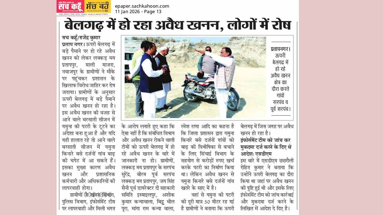 खनन विभाग की निष्क्रियता के चलते लंबे समय से चल रहे अवैध खनन और सच कहूं में प्रकाशित समाचार के मामलों पर अब खंड विकास एवं पंचायत कार्यालय प्रतापनगर ने सख्त रुख अपना लिया है। बीडीपीओ प्रतापनगर अभिषेक आनंद ने पंचायती जमीन पर अवैध खनन के मामलों में कार्रवाई करते हुए ग्राम पंचायत ताजेवाला और कन्यावाला के सरपंचों को नोटिस जारी कर जवाब तलब किया है। Pratap Nagar News