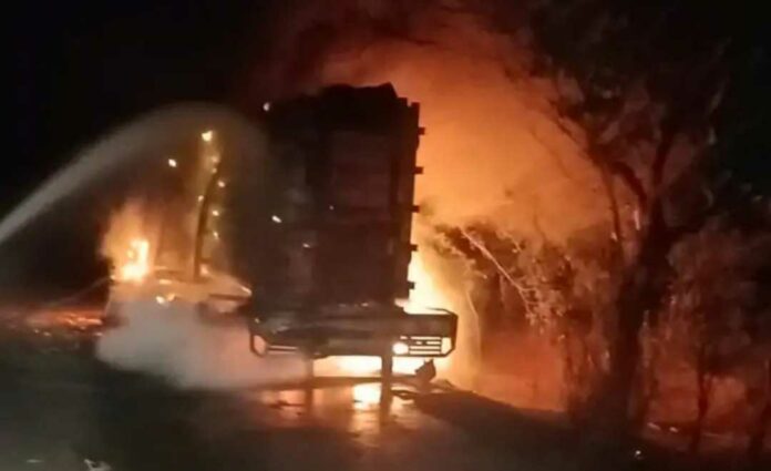 खन्ना (सच कहूँ न्यूज)। लुधियाना जिला के खन्ना शहर के निकटवर्ती गांव घुड़ानी के पास राड़ा साहिब रोड पर बुधवार देर रात करीब 11 बजे हाइड्रोजन सिलिंडरों से भरे एक ट्रक में भीषण आग लग गई। आग से कई सिलिंडरों में धमाके भी हुए जिससे आसपास के कई पेड़ भी आग की चपेट में आ गए। फायर ब्रिगेड ने मौके पर पहुंच आग को कंट्रोल किया जिससे बड़ा हादसा टल गया। अगर और देर होती तो सड़क किनारे पेड़ों में लगी आग विकराल रुप धारण करके गांव के अंदर तक भी जा सकती थी। Khanna News