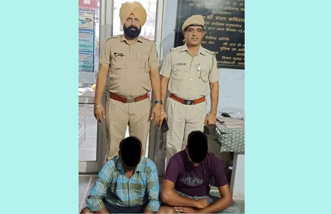 जानकारी के अनुसार विधानसभा चुनाव के मद्देनजर संगरिया पुलिस थाना की टीम ने सोमवार देर शाम को गांव ढाबां में पुलिस चौकी के सामने चौराहा पर एसआई लक्ष्मण सिंह के नेतृत्व में नाकाबंदी कर रखी थी। नाकाबंदी के दौरान पुलिस टीम ने एक मोटर साइकिल पर सवार होकर आए दो युवकों को रूकवाकर तलाशी ली तो उनके कब्जे से 35 ग्राम हेरोइन (चिट्टा) व आठ हजार रुपए की बिक्री राशि बरामद हुई। पुलिस ने बाइक जब्त कर मौके से कुलविन्द्र सिंह (26) पुत्र गुरदत्त सिंह मजहबी निवासी चोटिया पीएस सर्दुलगढ़ जिला मानसा पंजाब व गुरपाल सिंह (23) पुत्र बादलसिंह मजहबी निवासी बागीवानर पीएस तलवंडी साबो जिला बठिंडा पंजाब को गिरफ्तार कर लिया। मामले की जांच संगरिया पुलिस थाना प्रभारी रामचन्द्र कस्वां कर रहे हैं। Hanumangarh News